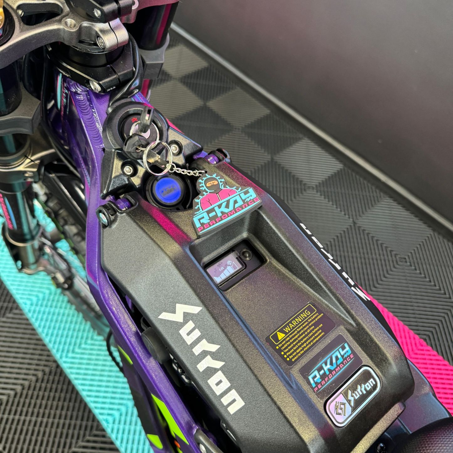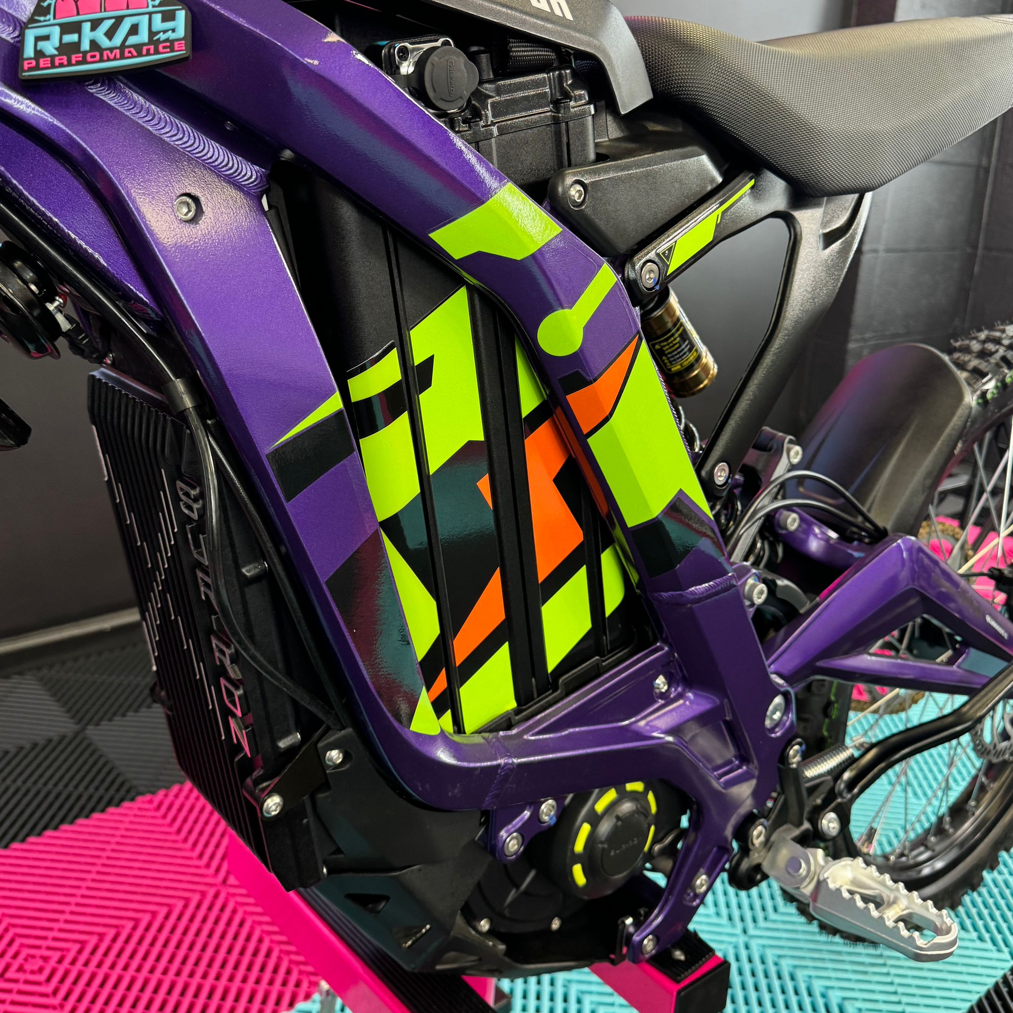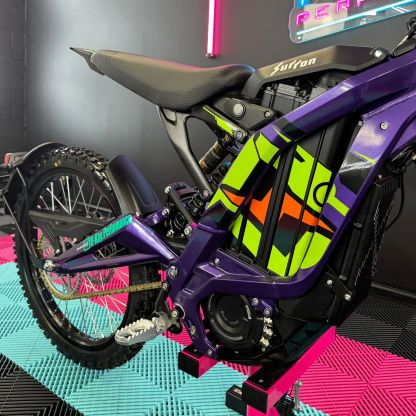 At R-Kay Performance, we're thrilled to offer the brand new Surron Light Bee X, a CE-approved UK-spec model. It's finished in Phantom Purple with eye-catching Green OEM stickers. With the latest 60v 40Ah Samsung Cell Battery, it delivers improved power and range, reaching speeds of up to 50mph. Plus, it comes with full 18 months warranty! It's an incredible package! 🎯