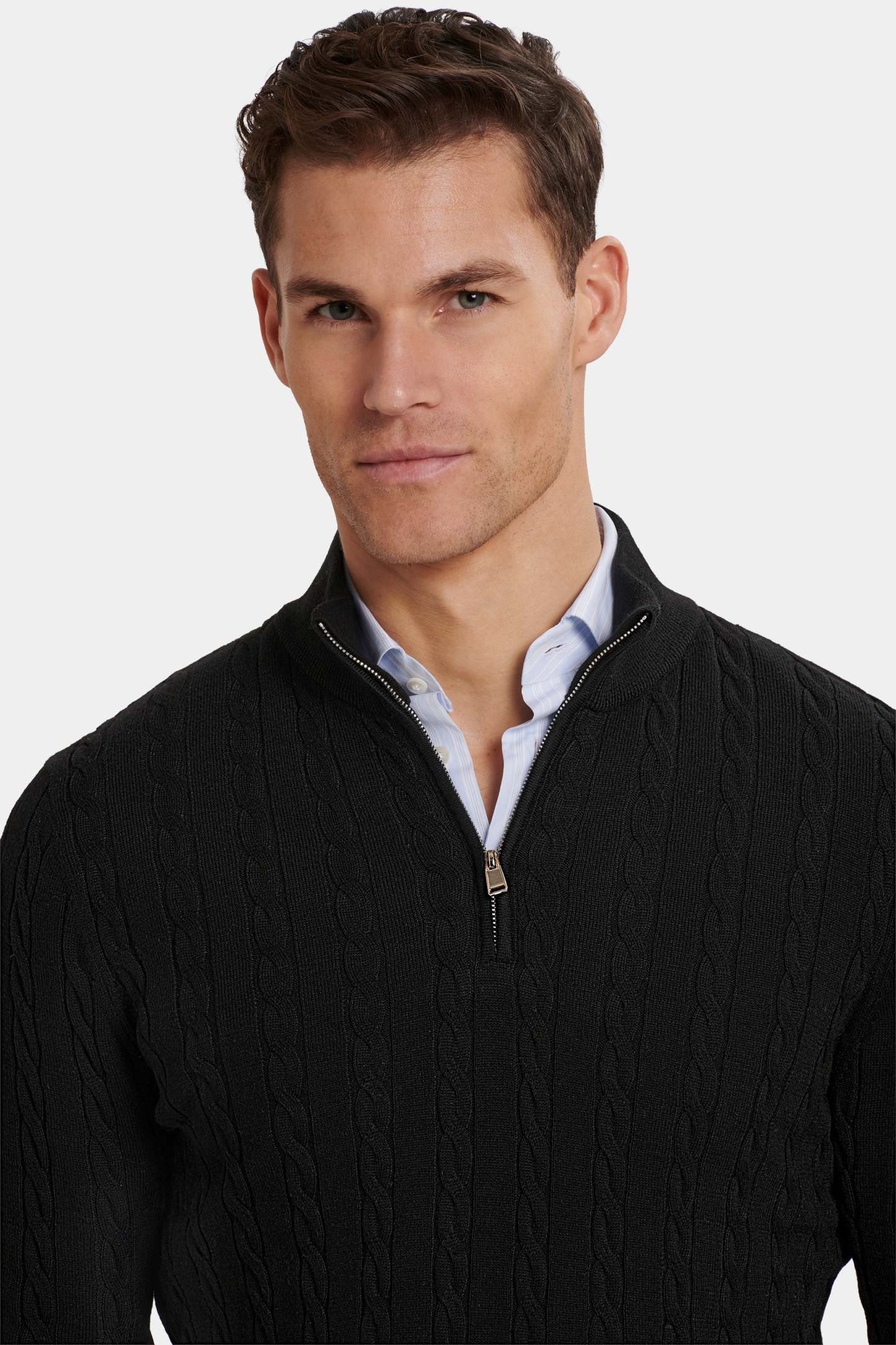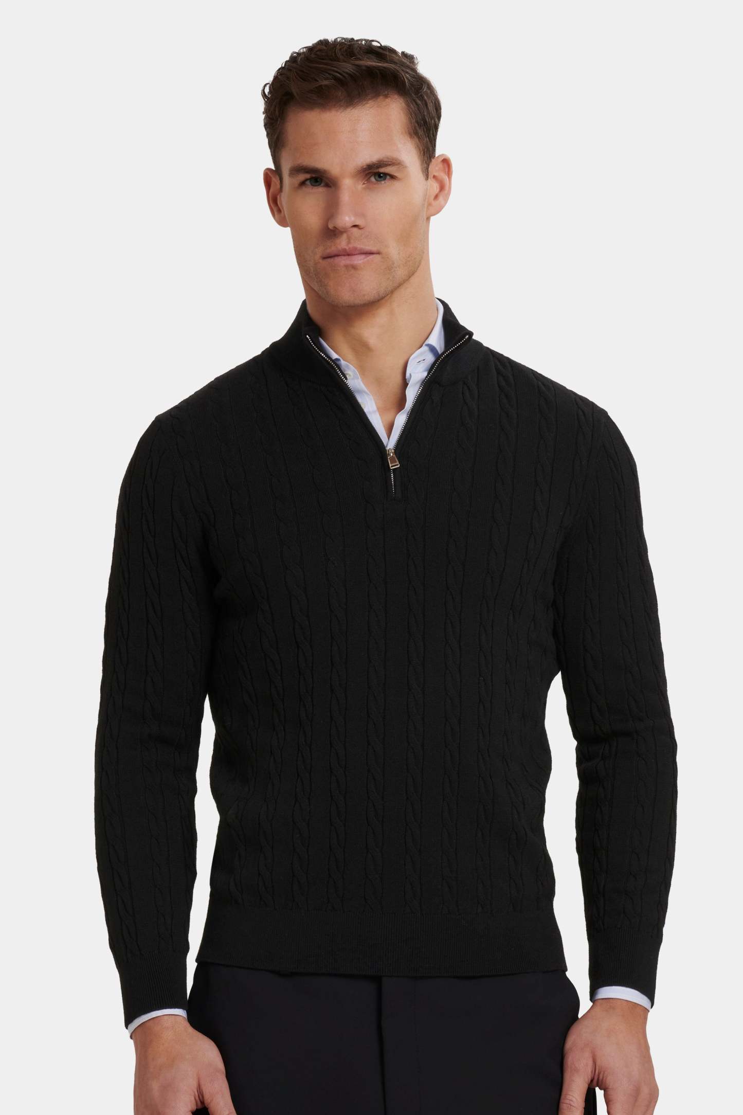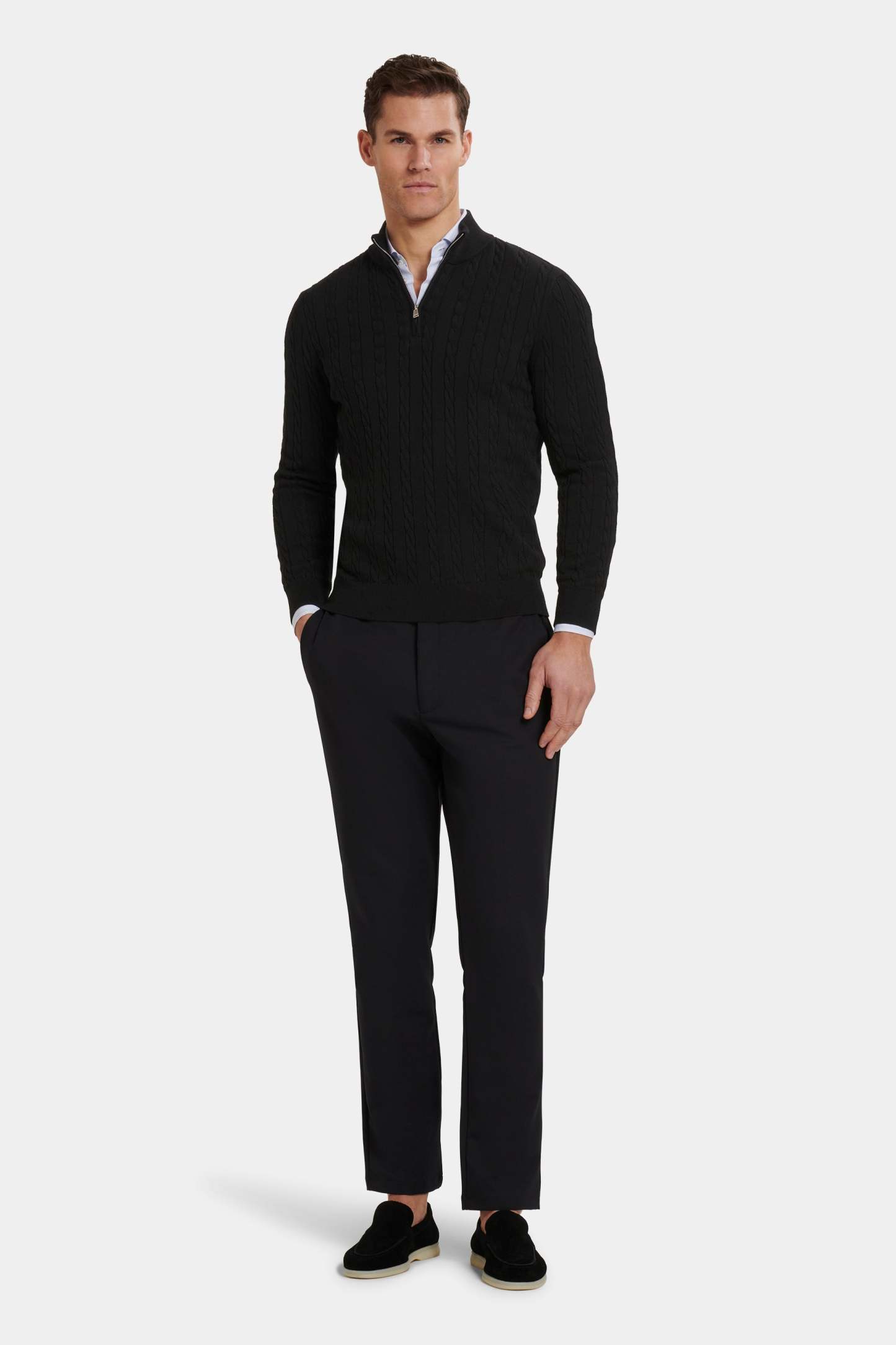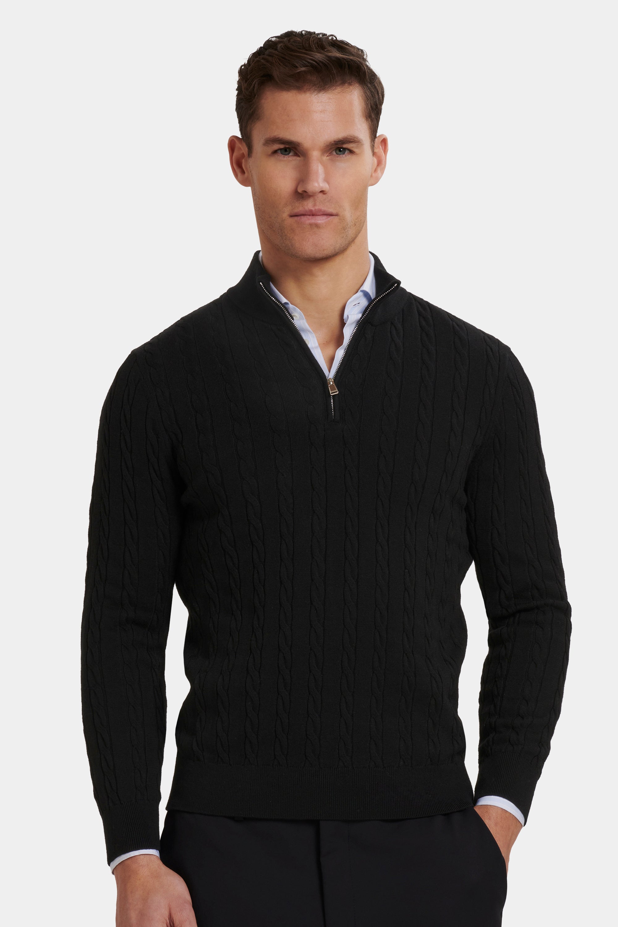 The Adamo Quarter Zip brings classic cable knit into a modern silhouette. The knit adds depth and character without becoming heavy or bulky. A tailored fit keeps the lines sharp, while the ribbed collar and zip closure finish the piece with quiet confidence.