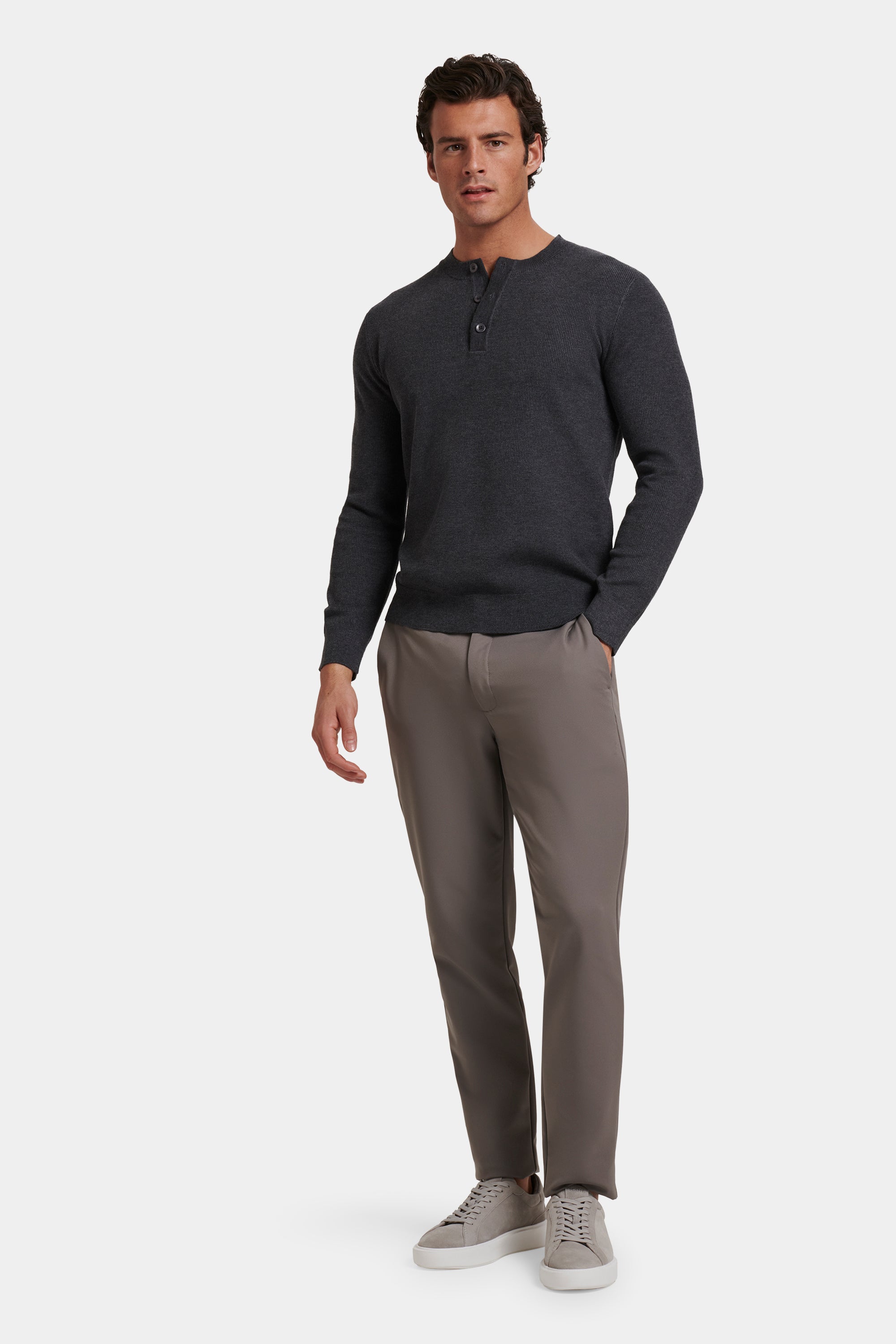 The Barna Henley is a modern take on a timeless silhouette. The slim fit keeps it clean and composed without feeling restrictive. Three buttons at the neckline add quiet detail; present without drawing attention. Ribbed trims at the cuffs and waistband keep the fit balanced from top to bottom.